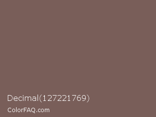Decimal 127221769 Color is a normal red color and the nearest color is Russett #755a57. Hex code #795e59 and RGB value is rgb(121,94,89). In RGB color space, this color is composed of 47% red, 37% green, 35% blue, In CMYK color space, this color is composed of 0% cyan, 22% magenta, 26% yellow , 53% black , In HSL color space, this color has a hue angle of 9° , 15% saturation and 41% lightness.
