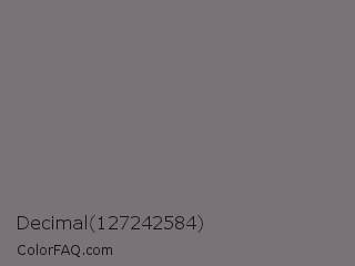 Decimal 127242584 Color is a normal magenta color and the nearest color is Sonic Silver #757575. Hex code #797276 and RGB value is rgb(121,114,118). In RGB color space, this color is composed of 47% red, 45% green, 46% blue, In CMYK color space, this color is composed of 0% cyan, 6% magenta, 2% yellow , 53% black , In HSL color space, this color has a hue angle of 326° , 3% saturation and 46% lightness.