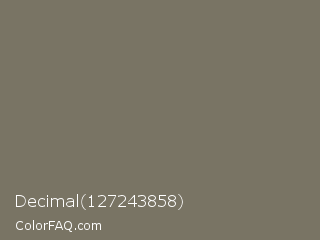Decimal 127243858 Color is a normal yellow color and the nearest color is Pablo #776f61. Hex code #797464 and RGB value is rgb(121,116,100). In RGB color space, this color is composed of 47% red, 45% green, 39% blue, In CMYK color space, this color is composed of 0% cyan, 4% magenta, 17% yellow , 53% black , In HSL color space, this color has a hue angle of 46° , 10% saturation and 43% lightness.