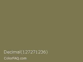 Decimal 127271236 Color is a normal yellow color and the nearest color is Go Ben #726d4e. Hex code #797650 and RGB value is rgb(121,118,80). In RGB color space, this color is composed of 47% red, 46% green, 31% blue, In CMYK color space, this color is composed of 0% cyan, 2% magenta, 34% yellow , 53% black , In HSL color space, this color has a hue angle of 56° , 20% saturation and 39% lightness.