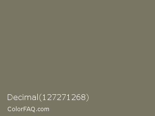 Decimal 127271268 Color is a normal yellow color and the nearest color is Pablo #776f61. Hex code #797664 and RGB value is rgb(121,118,100). In RGB color space, this color is composed of 47% red, 46% green, 39% blue, In CMYK color space, this color is composed of 0% cyan, 2% magenta, 17% yellow , 53% black , In HSL color space, this color has a hue angle of 51° , 10% saturation and 43% lightness.