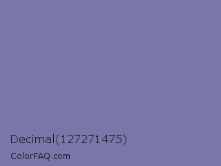 Decimal 127271475 Color is a normal indigo color and the nearest color is Kimberly #736c9f. Hex code #7976a9 and RGB value is rgb(121,118,169). In RGB color space, this color is composed of 47% red, 46% green, 66% blue, In CMYK color space, this color is composed of 28% cyan, 30% magenta, 0% yellow , 34% black , In HSL color space, this color has a hue angle of 244° , 23% saturation and 56% lightness.