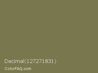 Decimal 127271831 Color is a normal yellow color and the nearest color is Gold Fusion #85754e. Hex code #79774d and RGB value is rgb(121,119,77). In RGB color space, this color is composed of 47% red, 47% green, 30% blue, In CMYK color space, this color is composed of 0% cyan, 2% magenta, 36% yellow , 53% black , In HSL color space, this color has a hue angle of 57° , 22% saturation and 39% lightness.