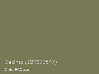 Decimal 127272547 Color is a normal yellow color and the nearest color is Crocodile #736d58. Hex code #797857 and RGB value is rgb(121,120,87). In RGB color space, this color is composed of 47% red, 47% green, 34% blue, In CMYK color space, this color is composed of 0% cyan, 1% magenta, 28% yellow , 53% black , In HSL color space, this color has a hue angle of 58° , 16% saturation and 41% lightness.