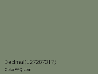 Decimal 127287317 Color is a normal green color and the nearest color is Camouflage Green #78866b. Hex code #79856f and RGB value is rgb(121,133,111). In RGB color space, this color is composed of 47% red, 52% green, 44% blue, In CMYK color space, this color is composed of 9% cyan, 0% magenta, 17% yellow , 48% black , In HSL color space, this color has a hue angle of 93° , 9% saturation and 48% lightness.