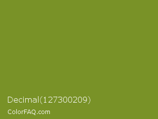 Decimal 127300209 Color is a normal lime color and the nearest color is Wasabi #788a25. Hex code #799227 and RGB value is rgb(121,146,39). In RGB color space, this color is composed of 47% red, 57% green, 15% blue, In CMYK color space, this color is composed of 17% cyan, 0% magenta, 73% yellow , 43% black , In HSL color space, this color has a hue angle of 74° , 58% saturation and 36% lightness.