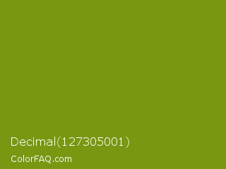 Decimal 127305001 Color is a normal lime color and the nearest color is Trendy Green #7c881a. Hex code #799711 and RGB value is rgb(121,151,17). In RGB color space, this color is composed of 47% red, 59% green, 7% blue, In CMYK color space, this color is composed of 20% cyan, 0% magenta, 89% yellow , 41% black , In HSL color space, this color has a hue angle of 73° , 80% saturation and 33% lightness.