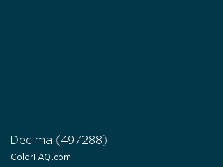 Decimal 497288 Color is a very dark blue color and the nearest color is Blue Whale #042e4c. Hex code #013748 and RGB value is rgb(1,55,72). In RGB color space, this color is composed of 0% red, 22% green, 28% blue, In CMYK color space, this color is composed of 99% cyan, 24% magenta, 0% yellow , 72% black , In HSL color space, this color has a hue angle of 194° , 97% saturation and 14% lightness.