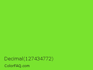 Decimal 127434772 Color is a normal green color and the nearest color is Kiwi #8ee53f. Hex code #79e32e and RGB value is rgb(121,227,46). In RGB color space, this color is composed of 47% red, 89% green, 18% blue, In CMYK color space, this color is composed of 47% cyan, 0% magenta, 80% yellow , 11% black , In HSL color space, this color has a hue angle of 95° , 76% saturation and 54% lightness.