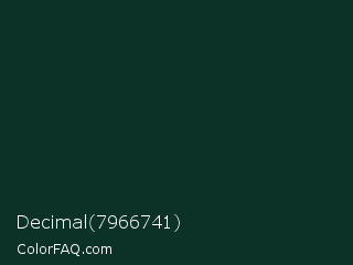 Decimal 7966741 Color is a very dark cyan color and the nearest color is Bottle Green #093624. Hex code #0c3127 and RGB value is rgb(12,49,39). In RGB color space, this color is composed of 5% red, 19% green, 15% blue, In CMYK color space, this color is composed of 76% cyan, 0% magenta, 20% yellow , 81% black , In HSL color space, this color has a hue angle of 164° , 61% saturation and 12% lightness.