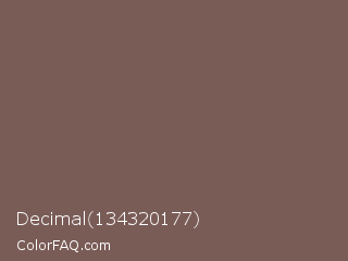 Decimal 134320177 Color is a normal red color and the nearest color is Russett #755a57. Hex code #7a5c57 and RGB value is rgb(122,92,87). In RGB color space, this color is composed of 48% red, 36% green, 34% blue, In CMYK color space, this color is composed of 0% cyan, 25% magenta, 29% yellow , 52% black , In HSL color space, this color has a hue angle of 9° , 17% saturation and 41% lightness.