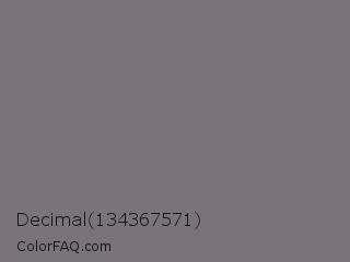 Decimal 134367571 Color is a normal magenta color and the nearest color is Sonic Silver #757575. Hex code #7a7379 and RGB value is rgb(122,115,121). In RGB color space, this color is composed of 48% red, 45% green, 47% blue, In CMYK color space, this color is composed of 0% cyan, 6% magenta, 1% yellow , 52% black , In HSL color space, this color has a hue angle of 309° , 3% saturation and 46% lightness.