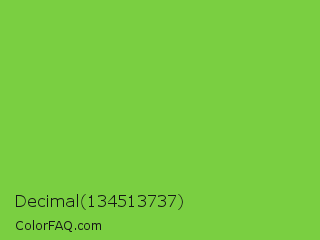 Decimal 134513737 Color is a normal green color and the nearest color is Kiwi #8ee53f. Hex code #7acf41 and RGB value is rgb(122,207,65). In RGB color space, this color is composed of 48% red, 81% green, 25% blue, In CMYK color space, this color is composed of 41% cyan, 0% magenta, 69% yellow , 19% black , In HSL color space, this color has a hue angle of 96° , 60% saturation and 53% lightness.