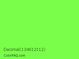 Decimal 134612112 Color is a light green color and the nearest color is Kiwi #8ee53f. Hex code #7afe4a and RGB value is rgb(122,254,74). In RGB color space, this color is composed of 48% red, 100% green, 29% blue, In CMYK color space, this color is composed of 52% cyan, 0% magenta, 71% yellow , 0% black , In HSL color space, this color has a hue angle of 104° , 99% saturation and 64% lightness.