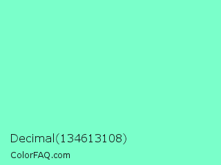 Decimal 134613108 Color is a light green color and the nearest color is Aquamarine #7fffd4. Hex code #7affca and RGB value is rgb(122,255,202). In RGB color space, this color is composed of 48% red, 100% green, 79% blue, In CMYK color space, this color is composed of 52% cyan, 0% magenta, 21% yellow , 0% black , In HSL color space, this color has a hue angle of 156° , 100% saturation and 74% lightness.