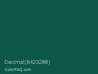 Decimal 8423288 Color is a very dark cyan color and the nearest color is Eden #105852. Hex code #0c574a and RGB value is rgb(12,87,74). In RGB color space, this color is composed of 5% red, 34% green, 29% blue, In CMYK color space, this color is composed of 86% cyan, 0% magenta, 15% yellow , 66% black , In HSL color space, this color has a hue angle of 170° , 76% saturation and 19% lightness.