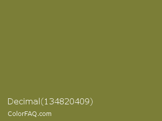 Decimal 134820409 Color is a normal yellow color and the nearest color is Pesto #7c7631. Hex code #7b7e37 and RGB value is rgb(123,126,55). In RGB color space, this color is composed of 48% red, 49% green, 22% blue, In CMYK color space, this color is composed of 2% cyan, 0% magenta, 56% yellow , 51% black , In HSL color space, this color has a hue angle of 63° , 39% saturation and 35% lightness.