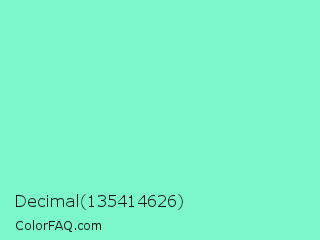 Decimal 135414626 Color is a light green color and the nearest color is Aquamarine #7fffd4. Hex code #7bf7ca and RGB value is rgb(123,247,202). In RGB color space, this color is composed of 48% red, 97% green, 79% blue, In CMYK color space, this color is composed of 50% cyan, 0% magenta, 18% yellow , 3% black , In HSL color space, this color has a hue angle of 158° , 89% saturation and 73% lightness.