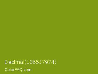 Decimal 136517974 Color is a normal lime color and the nearest color is Trendy Green #7c881a. Hex code #7d9c14 and RGB value is rgb(125,156,20). In RGB color space, this color is composed of 49% red, 61% green, 8% blue, In CMYK color space, this color is composed of 20% cyan, 0% magenta, 87% yellow , 39% black , In HSL color space, this color has a hue angle of 74° , 77% saturation and 35% lightness.