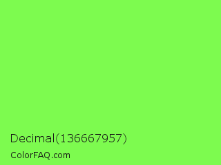 Decimal 136667957 Color is a light green color and the nearest color is Kiwi #8ee53f. Hex code #7dfb4f and RGB value is rgb(125,251,79). In RGB color space, this color is composed of 49% red, 98% green, 31% blue, In CMYK color space, this color is composed of 50% cyan, 0% magenta, 69% yellow , 2% black , In HSL color space, this color has a hue angle of 104° , 96% saturation and 65% lightness.
