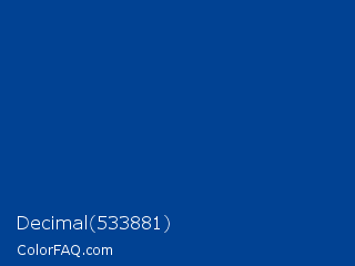 Decimal 533881 Color is a dark blue color and the nearest color is Congress Blue #02478e. Hex code #014293 and RGB value is rgb(1,66,147). In RGB color space, this color is composed of 0% red, 26% green, 58% blue, In CMYK color space, this color is composed of 99% cyan, 55% magenta, 0% yellow , 42% black , In HSL color space, this color has a hue angle of 213° , 99% saturation and 29% lightness.