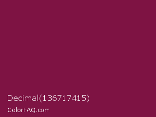 Decimal 136717415 Color is a dark rose color and the nearest color is Rose Bud Cherry #800b47. Hex code #7e1343 and RGB value is rgb(126,19,67). In RGB color space, this color is composed of 49% red, 7% green, 26% blue, In CMYK color space, this color is composed of 0% cyan, 85% magenta, 47% yellow , 51% black , In HSL color space, this color has a hue angle of 333° , 74% saturation and 28% lightness.