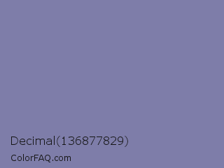 Decimal 136877829 Color is a normal indigo color and the nearest color is Shadow Blue #778ba5. Hex code #7e7da9 and RGB value is rgb(126,125,169). In RGB color space, this color is composed of 49% red, 49% green, 66% blue, In CMYK color space, this color is composed of 25% cyan, 26% magenta, 0% yellow , 34% black , In HSL color space, this color has a hue angle of 241° , 20% saturation and 58% lightness.
