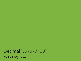 Decimal 137377408 Color is a normal green color and the nearest color is Sushi #87ab39. Hex code #7eb440 and RGB value is rgb(126,180,64). In RGB color space, this color is composed of 49% red, 71% green, 25% blue, In CMYK color space, this color is composed of 30% cyan, 0% magenta, 64% yellow , 29% black , In HSL color space, this color has a hue angle of 88° , 48% saturation and 48% lightness.