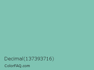 Decimal 137393716 Color is a light cyan color and the nearest color is Neptune #7cb7bb. Hex code #7ec3b2 and RGB value is rgb(126,195,178). In RGB color space, this color is composed of 49% red, 76% green, 70% blue, In CMYK color space, this color is composed of 35% cyan, 0% magenta, 9% yellow , 24% black , In HSL color space, this color has a hue angle of 165° , 37% saturation and 63% lightness.