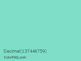 Decimal 137446759 Color is a light cyan color and the nearest color is Bermuda #7dd8c6. Hex code #7edec7 and RGB value is rgb(126,222,199). In RGB color space, this color is composed of 49% red, 87% green, 78% blue, In CMYK color space, this color is composed of 43% cyan, 0% magenta, 10% yellow , 13% black , In HSL color space, this color has a hue angle of 166° , 59% saturation and 68% lightness.