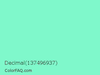 Decimal 137496937 Color is a light green color and the nearest color is Aquamarine #7fffd4. Hex code #7ef7c9 and RGB value is rgb(126,247,201). In RGB color space, this color is composed of 49% red, 97% green, 79% blue, In CMYK color space, this color is composed of 49% cyan, 0% magenta, 19% yellow , 3% black , In HSL color space, this color has a hue angle of 157° , 88% saturation and 73% lightness.