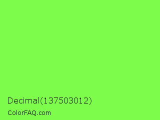 Decimal 137503012 Color is a light green color and the nearest color is Kiwi #8ee53f. Hex code #7efc4c and RGB value is rgb(126,252,76). In RGB color space, this color is composed of 49% red, 99% green, 30% blue, In CMYK color space, this color is composed of 50% cyan, 0% magenta, 70% yellow , 1% black , In HSL color space, this color has a hue angle of 103° , 97% saturation and 64% lightness.