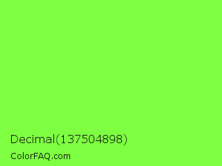 Decimal 137504898 Color is a light green color and the nearest color is Spring Frost #87ff2a. Hex code #7eff42 and RGB value is rgb(126,255,66). In RGB color space, this color is composed of 49% red, 100% green, 26% blue, In CMYK color space, this color is composed of 51% cyan, 0% magenta, 74% yellow , 0% black , In HSL color space, this color has a hue angle of 101° , 100% saturation and 63% lightness.