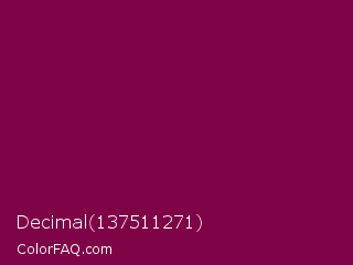 Decimal 137511271 Color is a dark magenta color and the nearest color is Rose Bud Cherry #800b47. Hex code #7f0447 and RGB value is rgb(127,4,71). In RGB color space, this color is composed of 50% red, 2% green, 28% blue, In CMYK color space, this color is composed of 0% cyan, 97% magenta, 44% yellow , 50% black , In HSL color space, this color has a hue angle of 327° , 94% saturation and 26% lightness.