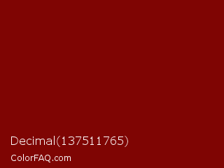 Decimal 137511765 Color is a dark red color and the nearest color is Barn Red #7c0a02. Hex code #7f0503 and RGB value is rgb(127,5,3). In RGB color space, this color is composed of 50% red, 2% green, 1% blue, In CMYK color space, this color is composed of 0% cyan, 96% magenta, 98% yellow , 50% black , In HSL color space, this color has a hue angle of 1° , 95% saturation and 25% lightness.