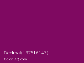 Decimal 137516147 Color is a dark magenta color and the nearest color is Cardinal Pink #8c055e. Hex code #7f0961 and RGB value is rgb(127,9,97). In RGB color space, this color is composed of 50% red, 4% green, 38% blue, In CMYK color space, this color is composed of 0% cyan, 93% magenta, 24% yellow , 50% black , In HSL color space, this color has a hue angle of 315° , 87% saturation and 27% lightness.