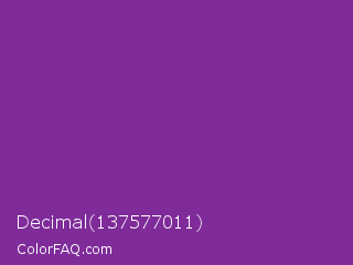 Decimal 137577011 Color is a normal purple color and the nearest color is Vivid Violet #803790. Hex code #7f2b99 and RGB value is rgb(127,43,153). In RGB color space, this color is composed of 50% red, 17% green, 60% blue, In CMYK color space, this color is composed of 17% cyan, 72% magenta, 0% yellow , 40% black , In HSL color space, this color has a hue angle of 286° , 56% saturation and 38% lightness.