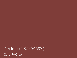 Decimal 137594693 Color is a normal red color and the nearest color is Lotus #863c3c. Hex code #7f3d39 and RGB value is rgb(127,61,57). In RGB color space, this color is composed of 50% red, 24% green, 22% blue, In CMYK color space, this color is composed of 0% cyan, 52% magenta, 55% yellow , 50% black , In HSL color space, this color has a hue angle of 3° , 38% saturation and 36% lightness.