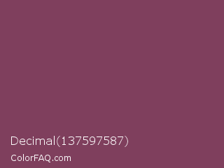 Decimal 137597587 Color is a normal rose color and the nearest color is Deep Ruby #843f5b. Hex code #7f3f5d and RGB value is rgb(127,63,93). In RGB color space, this color is composed of 50% red, 25% green, 36% blue, In CMYK color space, this color is composed of 0% cyan, 50% magenta, 27% yellow , 50% black , In HSL color space, this color has a hue angle of 332° , 34% saturation and 37% lightness.