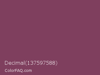 Decimal 137597588 Color is a normal rose color and the nearest color is Deep Ruby #843f5b. Hex code #7f3f5e and RGB value is rgb(127,63,94). In RGB color space, this color is composed of 50% red, 25% green, 37% blue, In CMYK color space, this color is composed of 0% cyan, 50% magenta, 26% yellow , 50% black , In HSL color space, this color has a hue angle of 331° , 34% saturation and 37% lightness.