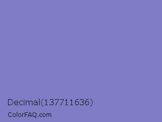 Decimal 137711636 Color is a light indigo color and the nearest color is Ube #8878c3. Hex code #7f7cc6 and RGB value is rgb(127,124,198). In RGB color space, this color is composed of 50% red, 49% green, 78% blue, In CMYK color space, this color is composed of 36% cyan, 37% magenta, 0% yellow , 22% black , In HSL color space, this color has a hue angle of 242° , 39% saturation and 63% lightness.