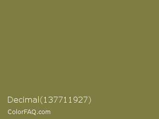 Decimal 137711927 Color is a normal yellow color and the nearest color is Old Moss Green #867e36. Hex code #7f7d41 and RGB value is rgb(127,125,65). In RGB color space, this color is composed of 50% red, 49% green, 25% blue, In CMYK color space, this color is composed of 0% cyan, 2% magenta, 49% yellow , 50% black , In HSL color space, this color has a hue angle of 58° , 32% saturation and 38% lightness.
