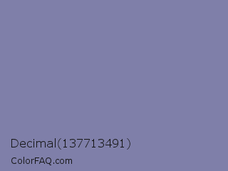 Decimal 137713491 Color is a normal blue color and the nearest color is Shadow Blue #778ba5. Hex code #7f7fa9 and RGB value is rgb(127,127,169). In RGB color space, this color is composed of 50% red, 50% green, 66% blue, In CMYK color space, this color is composed of 25% cyan, 25% magenta, 0% yellow , 34% black , In HSL color space, this color has a hue angle of 240° , 20% saturation and 58% lightness.