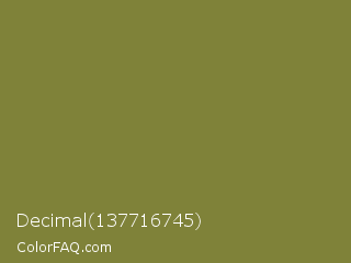 Decimal 137716745 Color is a normal yellow color and the nearest color is Old Moss Green #867e36. Hex code #7f8239 and RGB value is rgb(127,130,57). In RGB color space, this color is composed of 50% red, 51% green, 22% blue, In CMYK color space, this color is composed of 2% cyan, 0% magenta, 56% yellow , 49% black , In HSL color space, this color has a hue angle of 62° , 39% saturation and 37% lightness.