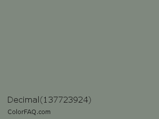 Decimal 137723924 Color is a normal green color and the nearest color is Battleship Grey #848482. Hex code #7f887e and RGB value is rgb(127,136,126). In RGB color space, this color is composed of 50% red, 53% green, 49% blue, In CMYK color space, this color is composed of 7% cyan, 0% magenta, 7% yellow , 47% black , In HSL color space, this color has a hue angle of 114° , 4% saturation and 51% lightness.