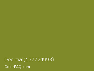 Decimal 137724993 Color is a normal yellow color and the nearest color is Wasabi #788a25. Hex code #7f8a29 and RGB value is rgb(127,138,41). In RGB color space, this color is composed of 50% red, 54% green, 16% blue, In CMYK color space, this color is composed of 8% cyan, 0% magenta, 70% yellow , 46% black , In HSL color space, this color has a hue angle of 67° , 54% saturation and 35% lightness.