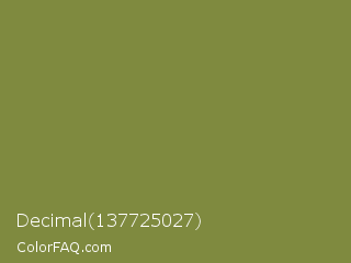 Decimal 137725027 Color is a normal yellow color and the nearest color is Old Moss Green #867e36. Hex code #7f8a3f and RGB value is rgb(127,138,63). In RGB color space, this color is composed of 50% red, 54% green, 25% blue, In CMYK color space, this color is composed of 8% cyan, 0% magenta, 54% yellow , 46% black , In HSL color space, this color has a hue angle of 69° , 37% saturation and 39% lightness.