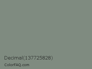 Decimal 137725828 Color is a normal green color and the nearest color is Dolphin Gray #828e84. Hex code #7f8b80 and RGB value is rgb(127,139,128). In RGB color space, this color is composed of 50% red, 55% green, 50% blue, In CMYK color space, this color is composed of 9% cyan, 0% magenta, 8% yellow , 45% black , In HSL color space, this color has a hue angle of 125° , 5% saturation and 52% lightness.