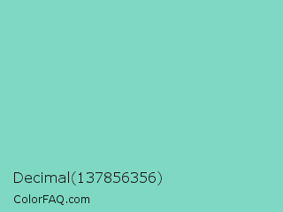 Decimal 137856356 Color is a light cyan color and the nearest color is Bermuda #7dd8c6. Hex code #7fd8c4 and RGB value is rgb(127,216,196). In RGB color space, this color is composed of 50% red, 85% green, 77% blue, In CMYK color space, this color is composed of 41% cyan, 0% magenta, 9% yellow , 15% black , In HSL color space, this color has a hue angle of 167° , 53% saturation and 67% lightness.