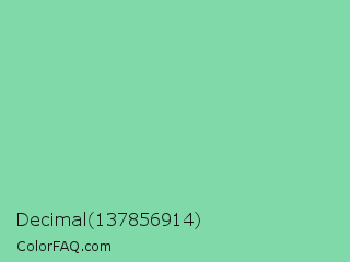 Decimal 137856914 Color is a light green color and the nearest color is Vista Blue #8fd6b4. Hex code #7fd9a8 and RGB value is rgb(127,217,168). In RGB color space, this color is composed of 50% red, 85% green, 66% blue, In CMYK color space, this color is composed of 41% cyan, 0% magenta, 23% yellow , 15% black , In HSL color space, this color has a hue angle of 147° , 54% saturation and 67% lightness.